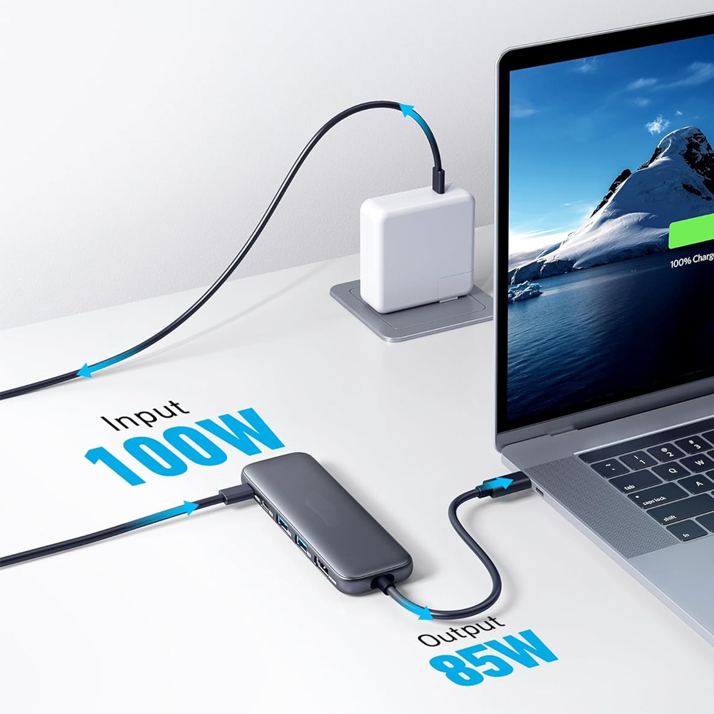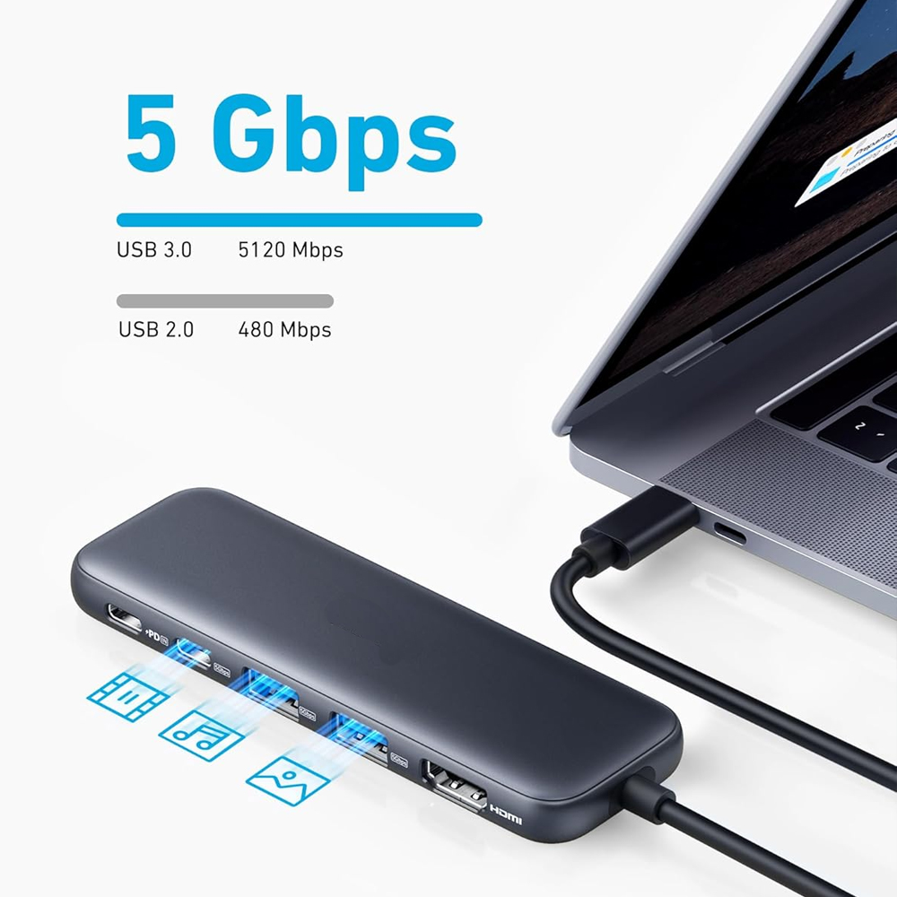 Compact 5-in-1 USB-C hub with 4K HDMI output, 1 powered USB-C, and 2 powered USB-A 3.0 ports. Fast, reliable, and perfect for MacBook, Dell, and more.